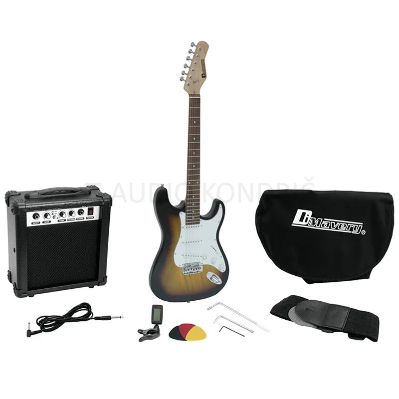 Set je sestavljen iz električne kitare, ojačevalca, pasu za kitaro, kabla, torbe za kitaro ter uglaševalca.
