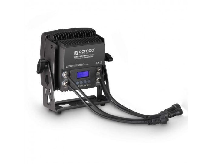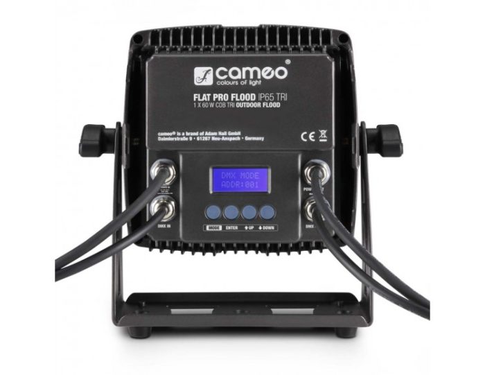 The Cameo FLAT PRO series FLOOD IP65 TRI is a compact outdoor LED flood light with IP65 rating, 120° beam angle and convection cooling. A 60 watt tri-color COB LED generates rich, saturated RGB colors with a 3,000 Hz refresh rate providing flicker free performance. The black heavy-duty metal enclosure features screw connectors for DMX and mains input and output plus a backlit display with mode, enter, up and down keys for easy operation. The Cameo FLOOD IP65 TRI allows for 2-channel, 3-channel 1, 3-channel 2 and 6-channel DMX control as well as master, slave and standalone modes while a setting lock prevents unauthorized menu access. The universal bracket adds a wide variety of mounting options. Barn doors are available as accessory.