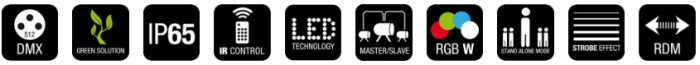 - Professional IP65 outdoor PAR can with 4 x 32 W RGBW Osram OSTAR LEDs and 8° beam angle