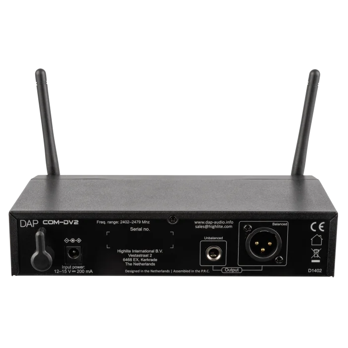 DAP COM DV-2 je brezžični ročni mikrofonski set, ki deluje v brezplačnem 2,4-GHz pasu.