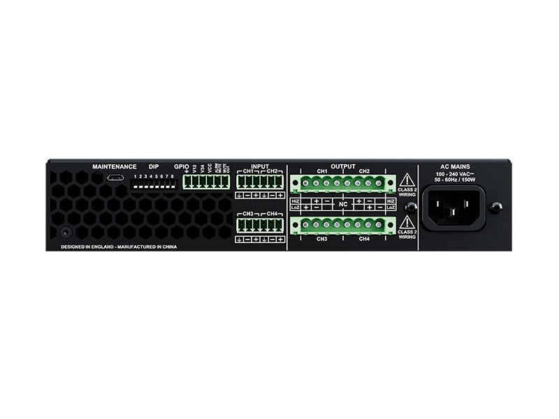 Sprednja plošča ponuja štiri jasno označene vhode z individualnimi gumbi za glasnost in LED indikacijo, kar omogoča hitro prilagajanje ravni glasnosti za glasbo v ozadju, mikrofon ali druge avdio vire. Vgrajeni DSP poskrbi za natančno obdelavo signala, zaščito zvočnikov in stabilno delovanje sistema pri vsakodnevni 24/7 uporabi, kar zmanjšuje potrebo po dodatni opremi in servisnih posegih.