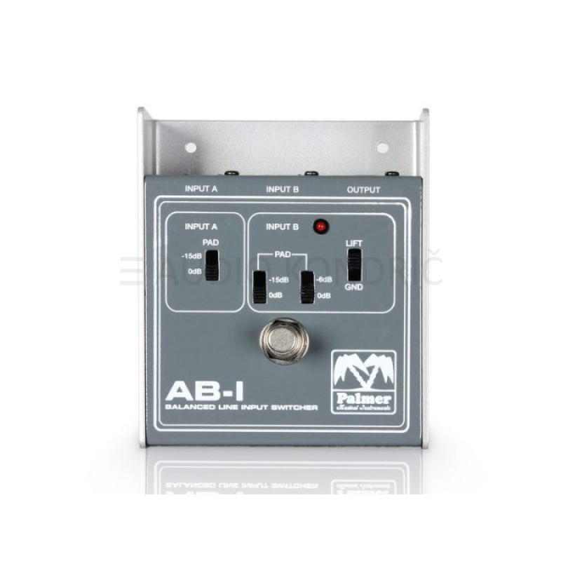 The Palmer PEABI is more than a simple switcher for two sources, it also provides level adjustment of microphone or line signals. Whether microphone or line signal, the PEABI toggles silently between the two inputs permitting fast and simple signal comparison and the connection of two sources to one input. Three slide switches select 15 dB of attenuation for input A and 6, 15 or 21 dB for input B. A ground lift switch eliminates earth loop hum. The PEABI is housed in a solid metal case with extended edges for optimum protection of the inputs and output. A red LED clearly indicates which input is active.