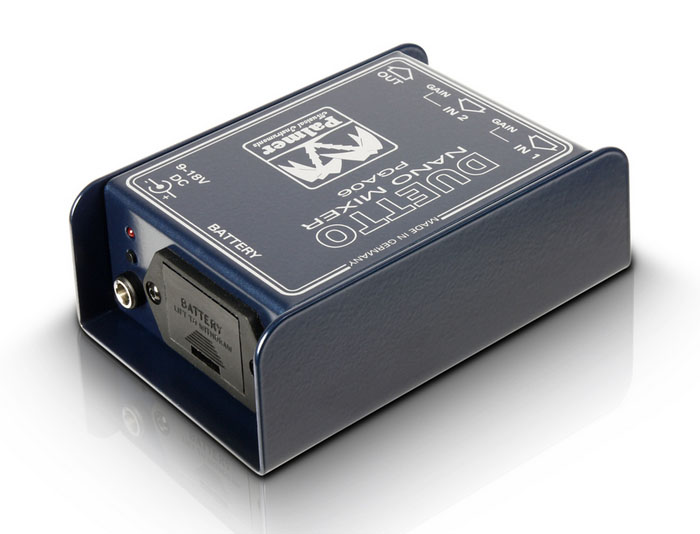 The Palmer DUETTO is a small format active mixer. Input sensitivity and impedance are optimised for electric guitar applications but the unit also works well with other instruments and devices with line level signals.