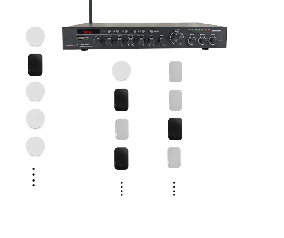 - Fleksibilnost 100V sistema: Na sistem lahko priklopite poljubno število zvočnikov različnih moči (3W, 6W, 10W…), dokler skupni seštevek ne preseže moči ojačevalnika.