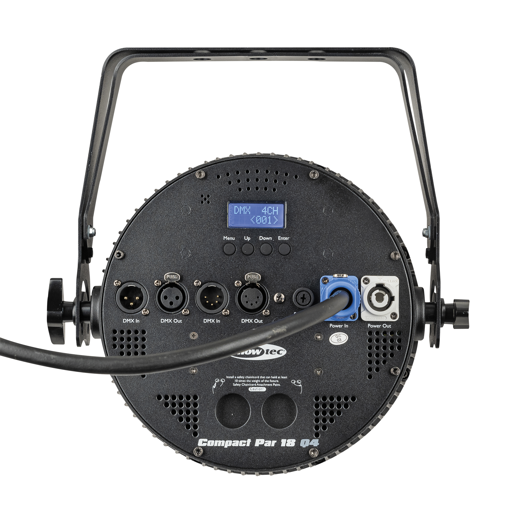 Showtec Compact Par 18 Q4 je kompakten RGBW LED par s 18 x 7 vatnimi LED diodami, opremljen z dvojnim nosilcem za enostavno postavitev na tla, primeren za notranje prostore. Ima 15° fiksni kot žarka in nudi zatemnitev od 0 do 100 % ter stroboskopske učinke pri 20 Hz, kar je popolnoma primerno za mešanje barv na kratki razdalji. Compact Par 18 Q4 se lahko nadzira ročno, preko DMX ter v načinu Master/Slave v ročnem, samodejnem in zvoku nadzorovanem načinu z vgrajenimi programi.