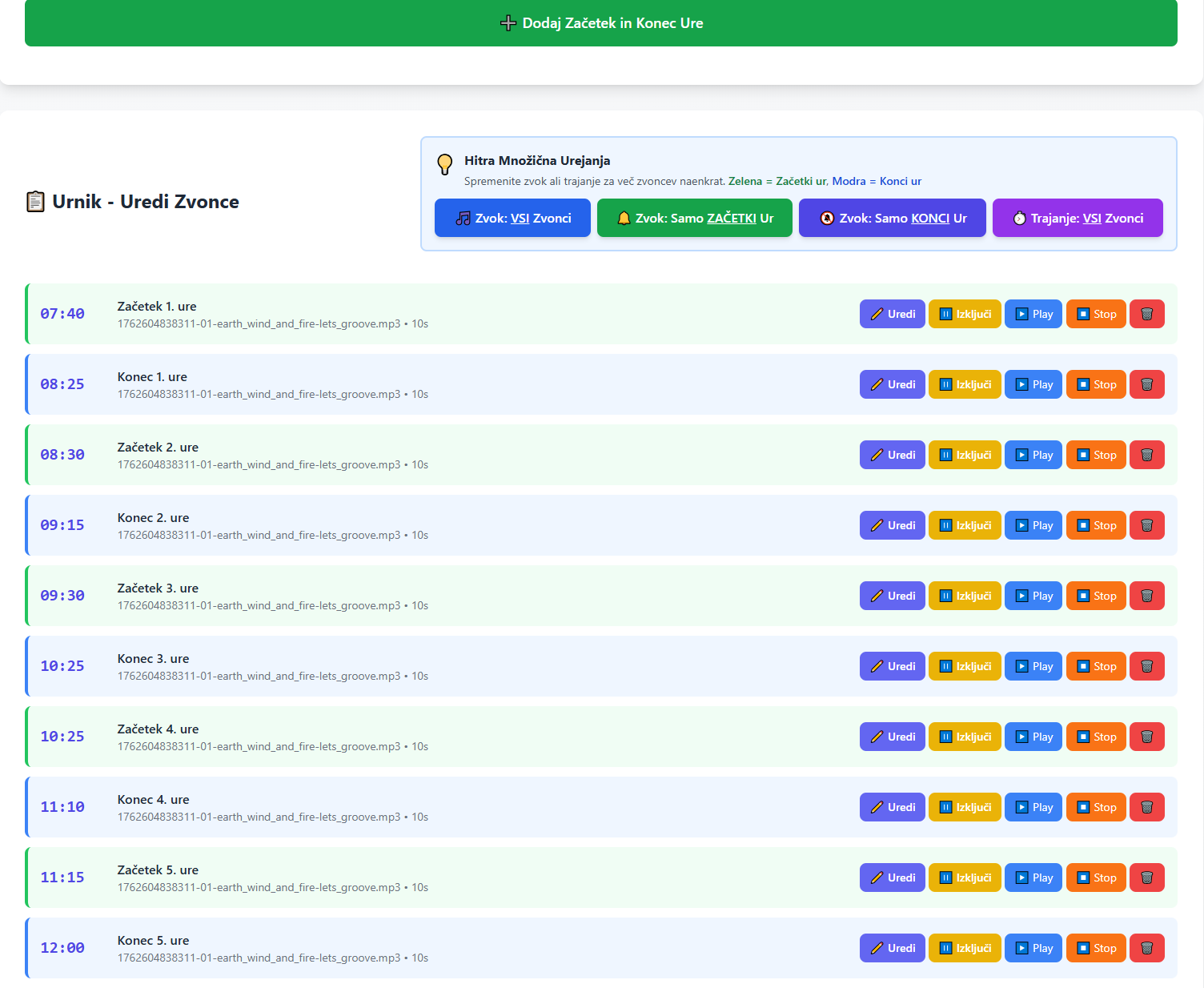 ▶️ Play predvaja zvonec takoj, ⏹️ Stop ustavi predvajanje.