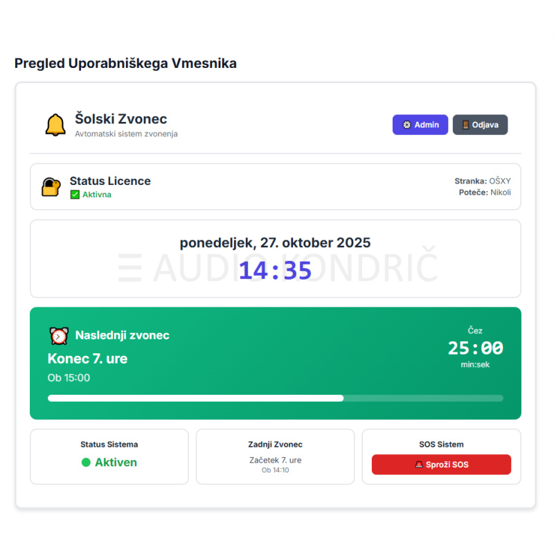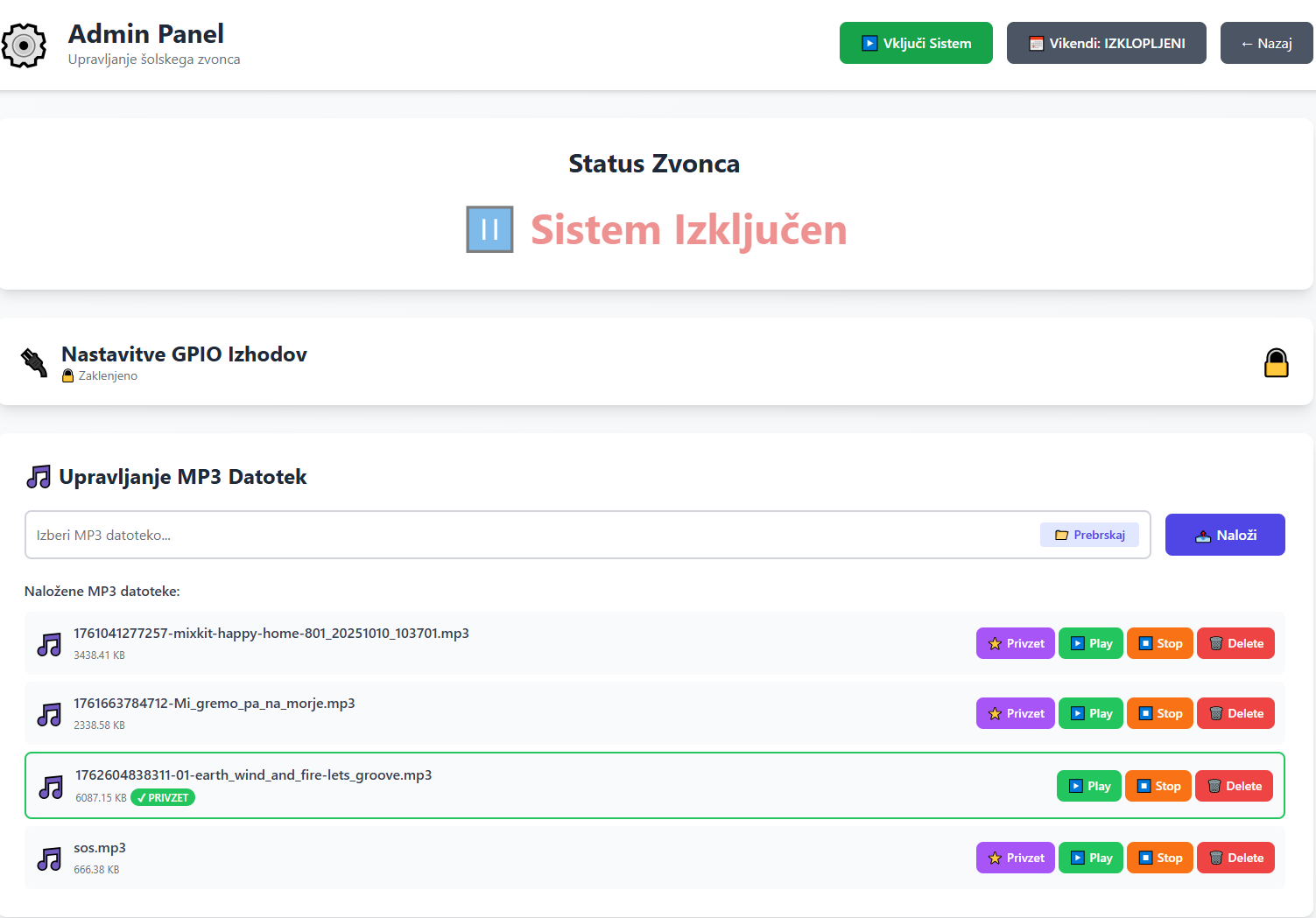 • Alarm (ročno sproženo zvonjenje): Sistem vključuje funkcijo alarm, ki sproži neprekinjeno zvonjenje (oz. predvajanje alarmnega zvoka) izven običajnega urnika. To je uporabno za izredne razmere (npr. požarni alarm, evakuacija) ali druge primere, ko želite ročni vklop zvonca. Alarm se lahko sproži in ustavi prek spletnega vmesnika z gumbom, ali fizično s pritiskom na namenski gumb, priklopljen na sistem.